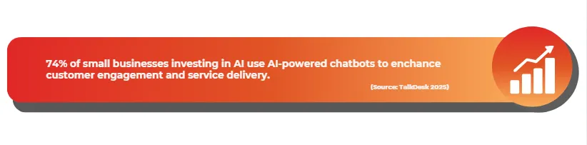 74% of small and medium businesses investing in AI use AI-powered chatbots to enhance customer engagement and service delivery. (TalkDesk Inc, 2025)