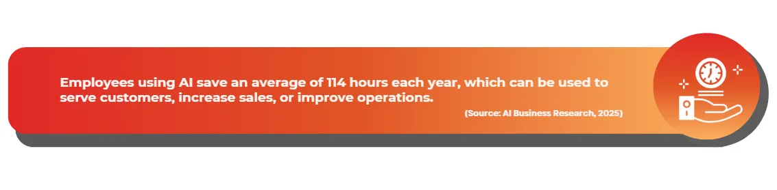 Employees save an average of 114 hours per year using AI, freeing time for growth, sales, and strategy. (AI Business Research, 2025)